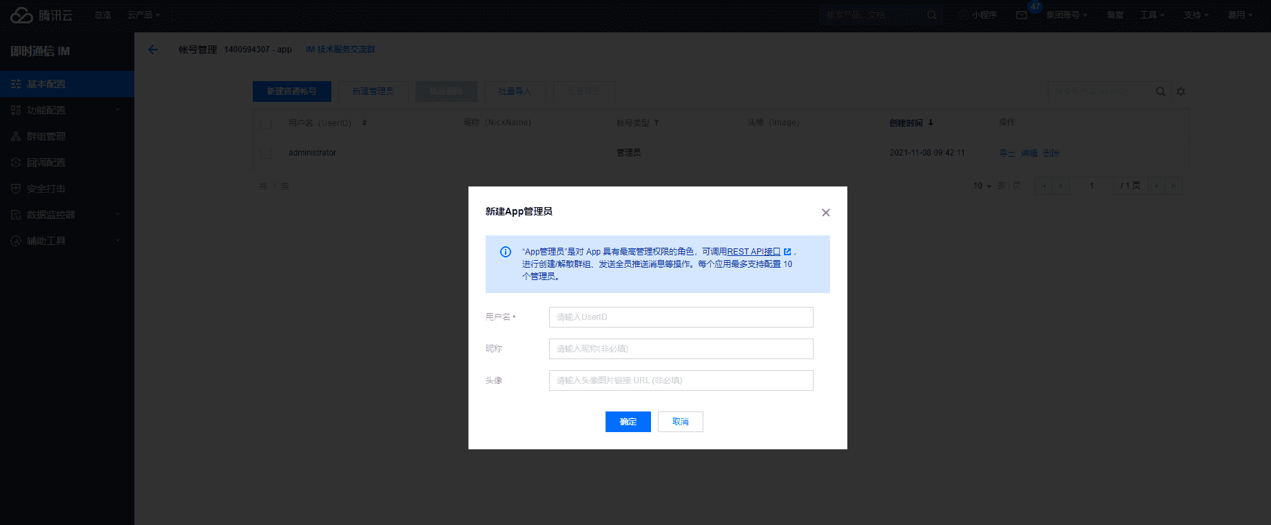 “App 管理员”是对 App 具有最高管理权限的角色,可调用 REST API 接口,进行创建/解散群组、发送全员推送消息等操作。每个应用最多支持配置 10 个管理员。